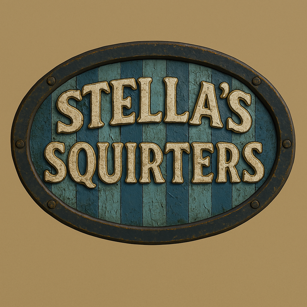 Wooden sign with Stella's Squirters text. smooth edges, simple geometry, game-ready, symmetric geometry.