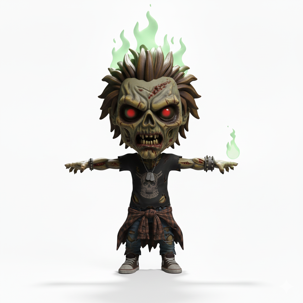 Zombie punk character with flaming hair. complex geometry, sharp edges, game-ready, character, symmetric geometry.
